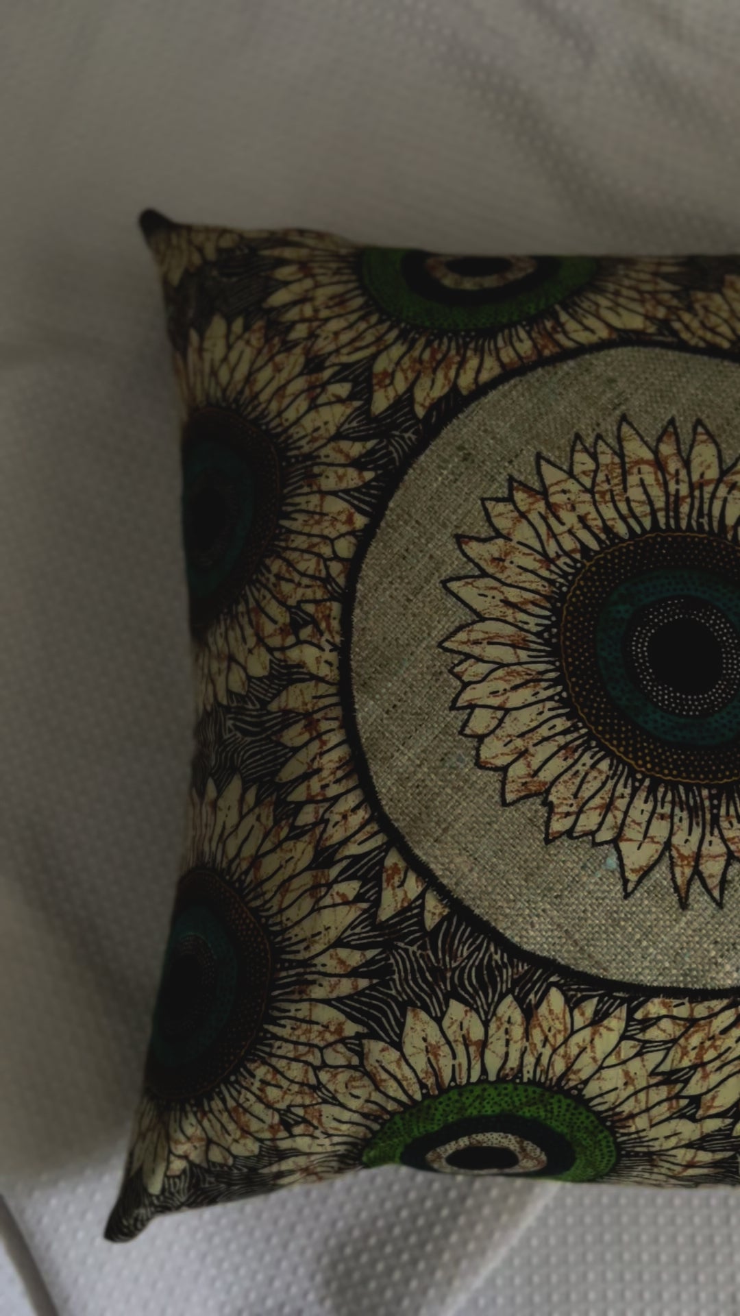 Majestic and hypnotic, Crowned features a stunning oversized circular motif inspired by African wax print sunflowers. Cream, gold, emerald, and deep turquoise collide in an intricate, almost regal composition. A true statement piece for the culturally attuned.